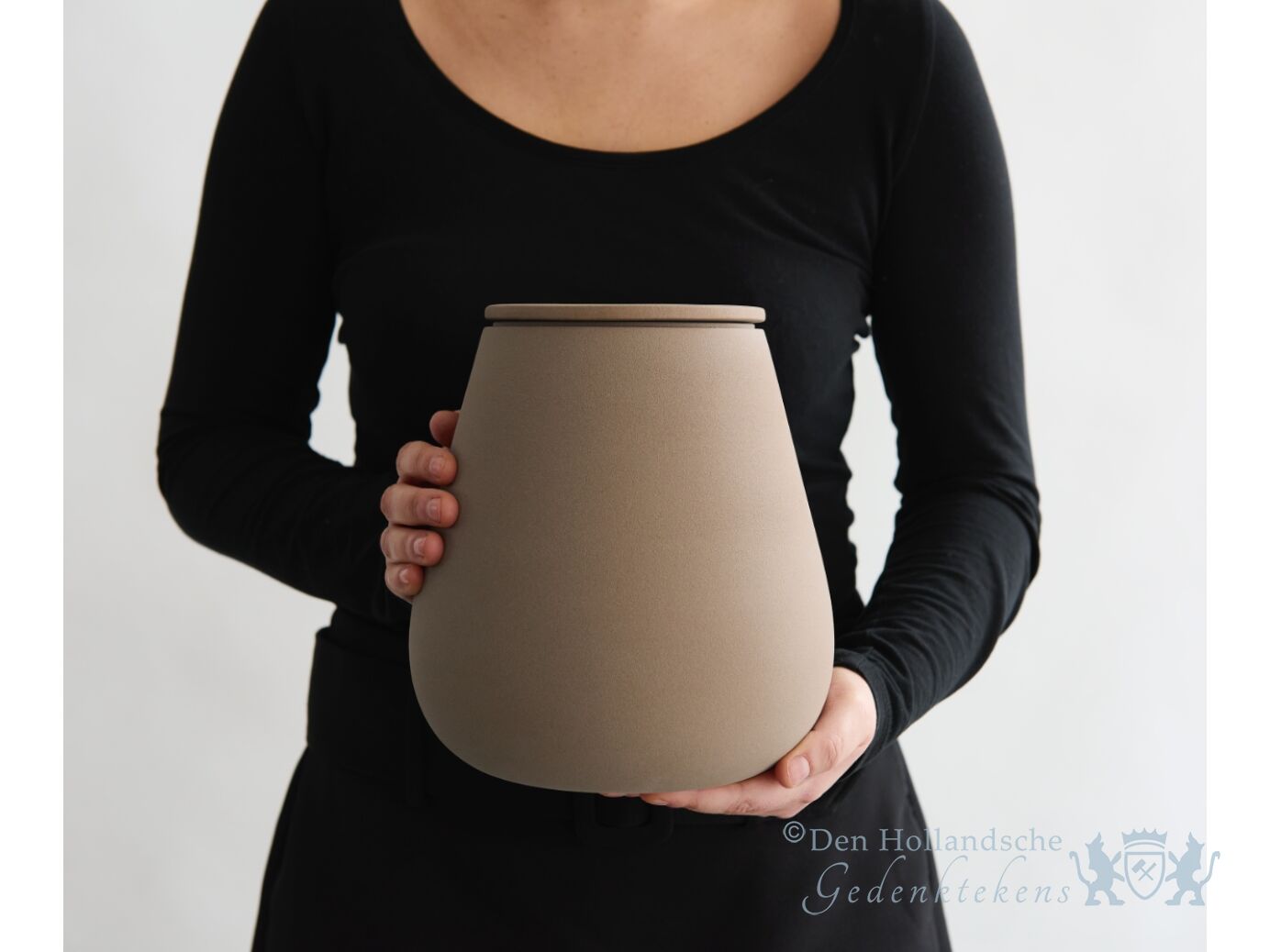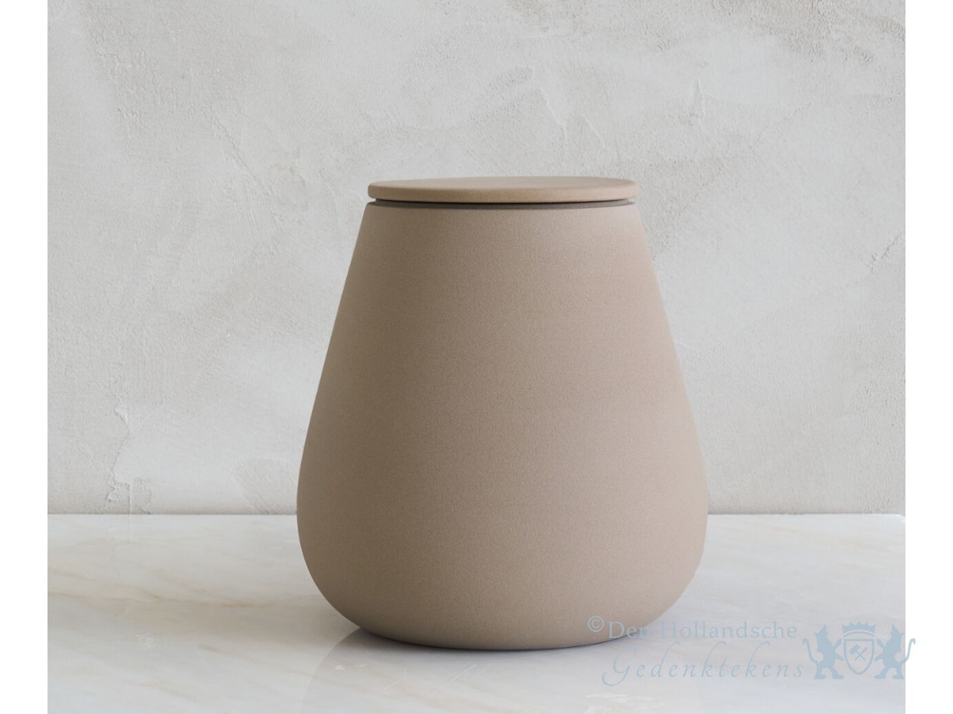 Athos zandkleurig – een klassieke urne (3,8 liter), handgemaakt in zandkleurige engobe keramiek, waarin u de as van een dierbare geliefde in schoonheid en rust kan bewaren.