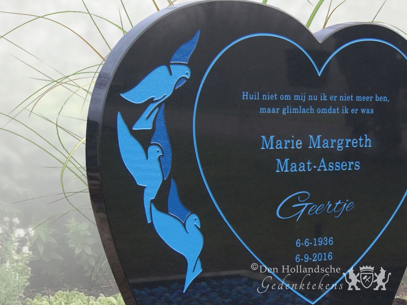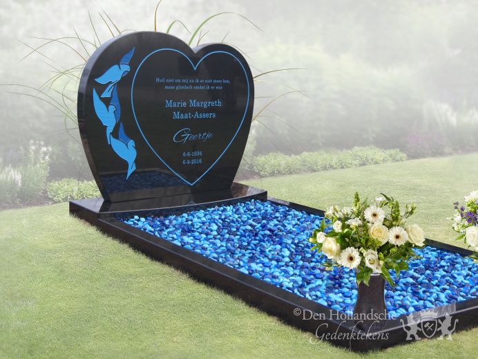 Door diepblauw met zwart te combineren ontstaat er een moderne, bijna futuristische sfeer. Deze grafsteen bestaat uit een groot hart gemaakt van zwart natuursteen. Omdat het natuursteen is gepolijst wordt de kleur intenser een heeft het oppervlak een duurzame glans. Bij gedenktekens waaraan de kleur blauw wordt toegevoegd, wordt vaak gekozen voor een lichte kleur blauw. Hier is echter gekozen voor een diepe blauwe kleur. Op het grote hart zijn de teksten, de lijntekening van het tweede hart en de afbeelding van de duiven uitgespaard en met deze blauwe kleur ingeschilderd. De glasparels die binnen de zwarte natuurstenen omranding het liggende deel bedekken, hebben ook deze blauwe kleur.