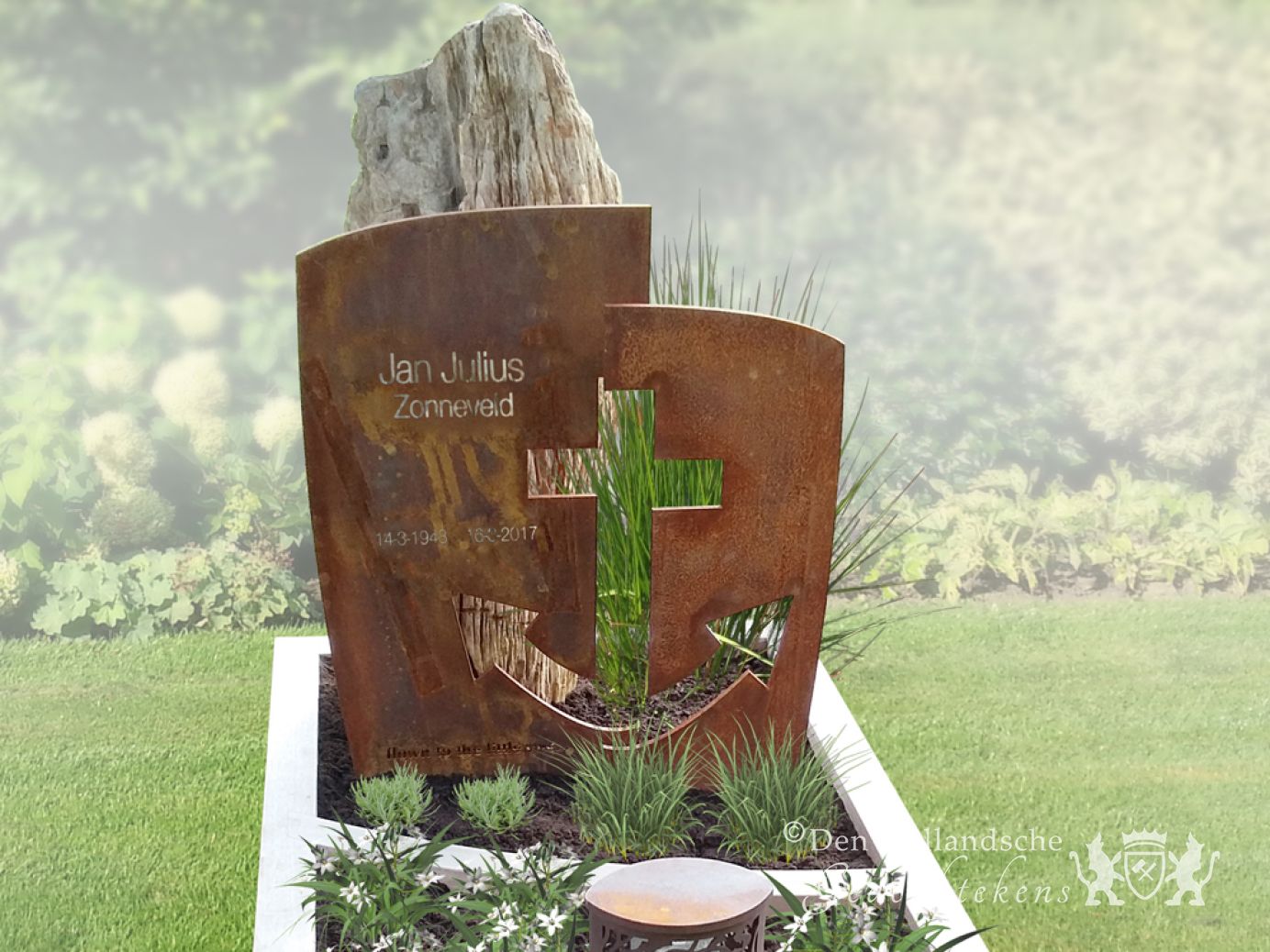 Cortenstaal wordt steeds vaker toegepast in gedenktekens. Vanwege de levendige roestbruine kleur heeft het een warme uitstraling en wordt het ook steeds vaker gekozen. In tegenstelling tot wat de roestkleur wellicht doet vermoeden, is het materiaal zeer weervast.Versteend hout