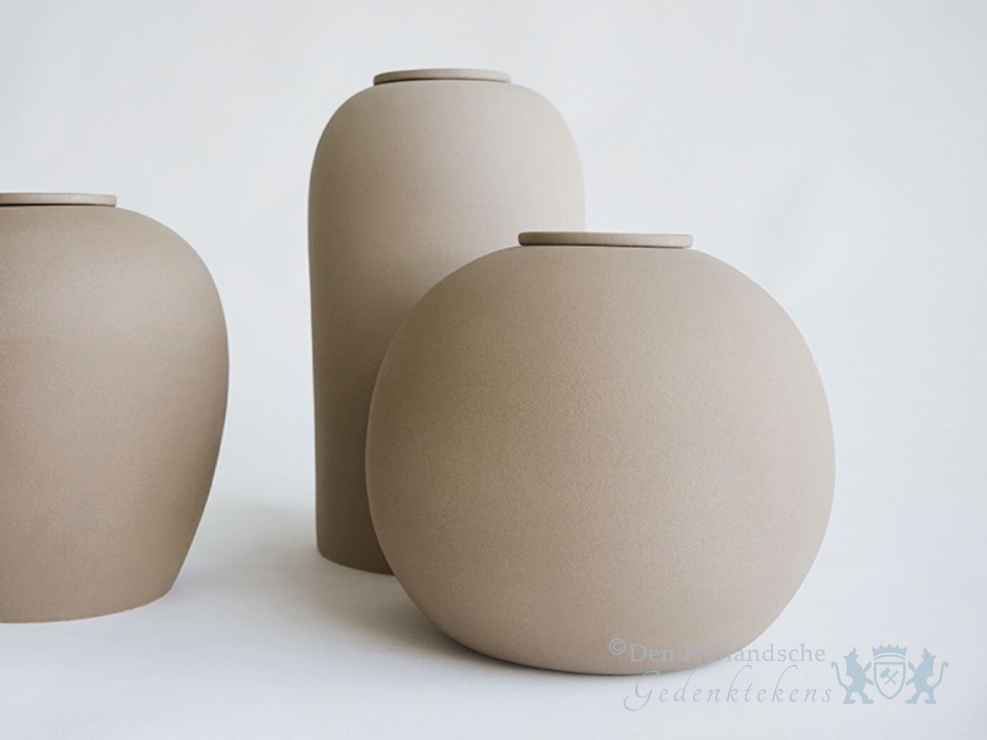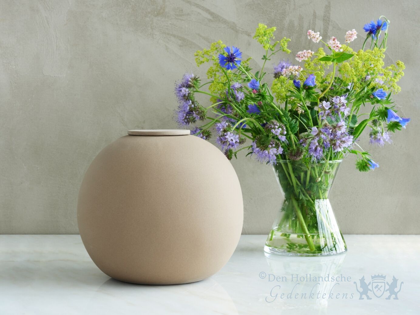 Een elegante bolvormige urn met een inhoud voor de volledige as (4 liter), handgemaakt in zandkleurige engobe keramiek, waarin u de as van een dierbare geliefde in schoonheid en rust kan bewaren.
