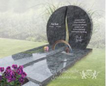 Voor dit grafmonument is er gekozen voor een natuursteen met een levendige textuur. Het is bijna niet te zien op de foto, maar naast de donkergrijze kleurtinten, bevat het natuursteen ook een olijfgroene kleurtint. Het grafmonument krijgt er een warmere uitstraling van. Een fraai detail is de rand van van de lettersteen. Deze is namelijk grof gehakt, wat voor een mooi evenwicht zorgt in het ontwerp. Op de ronde lettersteen, die eigenlijk uit twee helften bestaat, is veel ruimte voor tekst en een illustratie gehouden. Daarnaast is op het liggende deel een bronzen accessoire, met de beeltenis van een regenboog geplaatst. Accessoires als deze worden altijd door ons stevig verankerd.