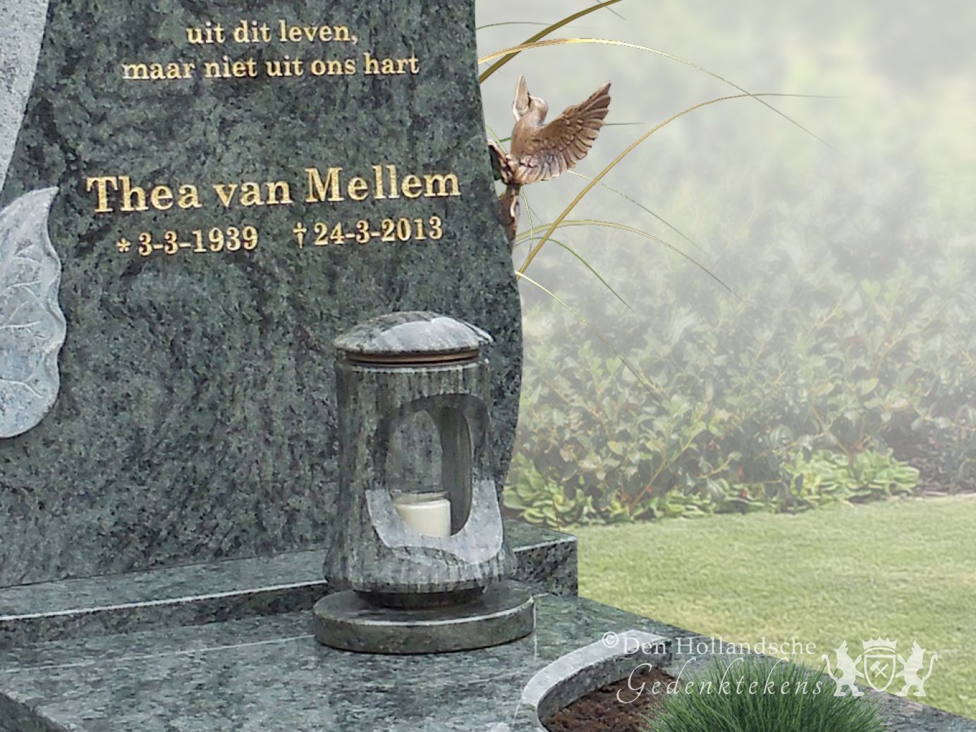 Grafsteen met een handgehakte calla verwerkt in de letterplaat. De graflantaarn is uit hetzelfde materiaal gemaakt waardoor deze niet afsteekt tegen de rest van het grafmonument. Door het gebruik van beelden of symbolen kunt u het gedenkteken personali... lees meer >