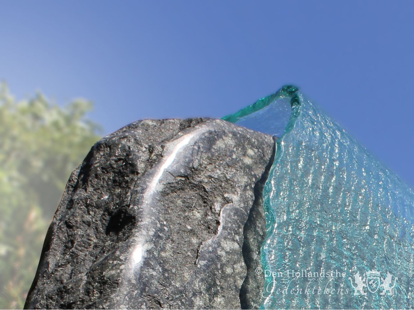 Het glas is door verhitting om de grafsteen gebogen. De glasplaat vouwt als een waterval om het grafmonument. In onze showtuin staan tientallen grafstenen met glas opgesteld.