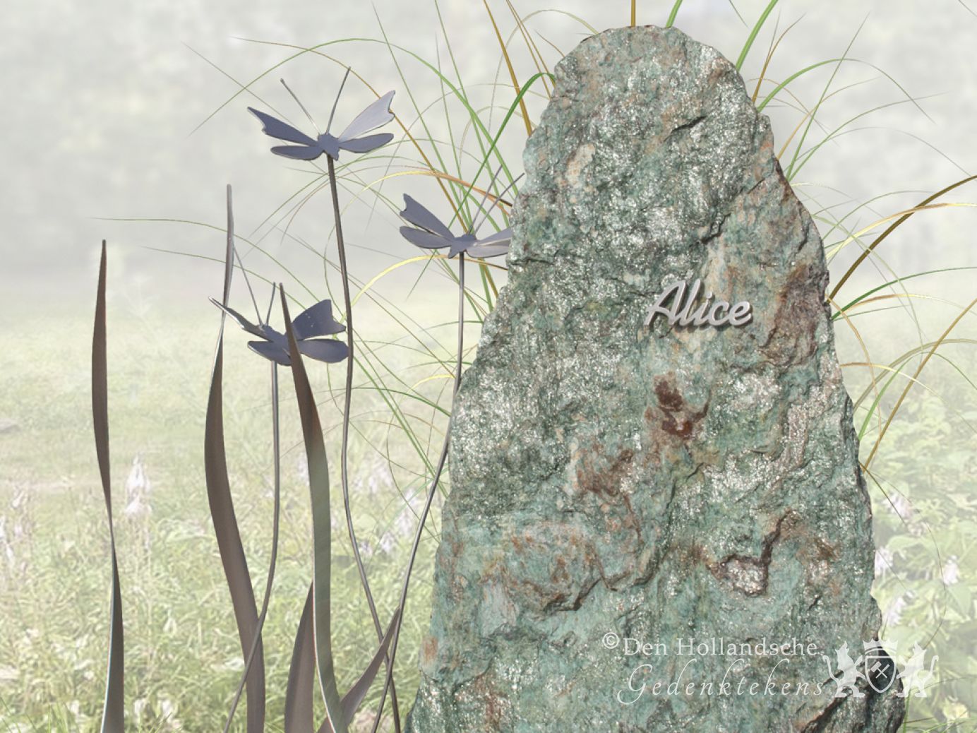 Deze groene grafsteen laat zich goed combineren met RVS. De natuurlijke vlinders en de naam zijn beide uit RVS vervaardigd. De groene siergrassen maken het een compleet en natuurlijk grafmonument.