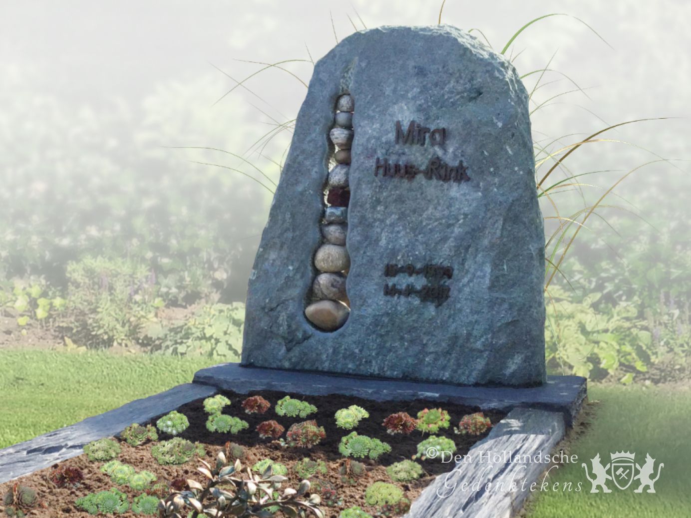 De natuur levert ons de mooiste materialen, vormen en kleuren. Een gevonden stuk steen, een boomstam dat in de loop van miljoenen jaren is versteend of een fraai stuk hout. Daar maken we graag gebruik van. Natuurlijke gedenktekens zijn er in veel verschillende vormen en uitvoeringen. In onze collectie vindt u zowel gedenktekens die enkel en alleen uit puur natuurlijke materialen bestaan als natuurlijke gedenktekens die geïnspireerd zijn op de natuur.Enkele grafsteen - met vloer