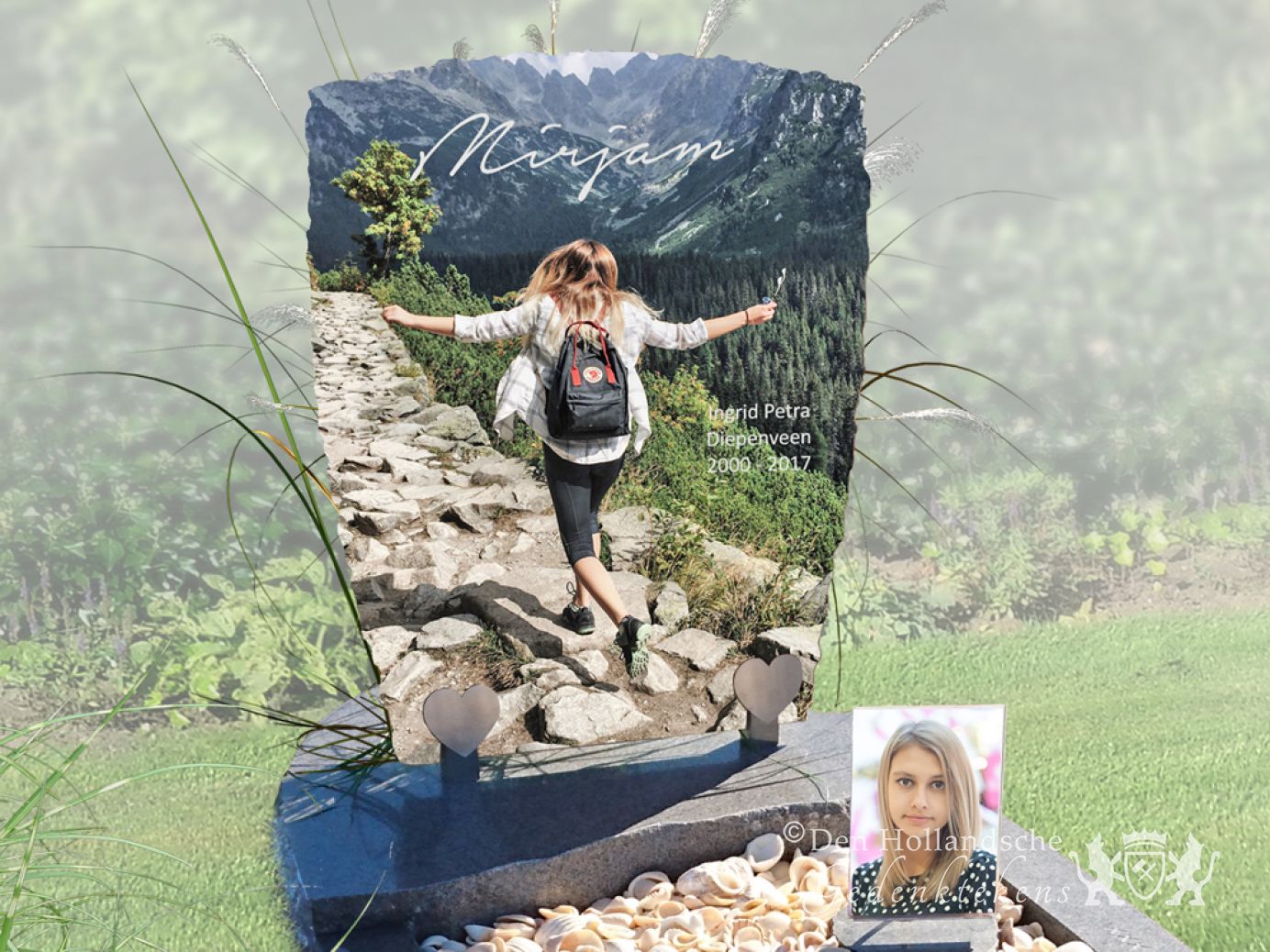 Bij een gedenkteken voor een tiener is het belangrijk dat er veel persoonlijke kernmerken in het ontwerp worden verwerkt. Zo blijft het gedenkteken dichtbij de persoon. Dit gedenkteken is voor een jonge dame ontworpen die veel hield van reizen. Daarom is er gekozen voor een graf foto en decoraties die met reizen te maken hebben. De graf foto op de glazen letterplaat met op een nonchalante manier gebrokkelde randen is een vakantiefoto. Hiervan is een eenvoudige compositie gemaakt waarin de opschriften zijn verwerkt. Het liggende deel refereert met de schelpjes als grafbedekking naar de zee en is er een twee kleinere portretfoto geplaatst. In de natuurstenen omranding zijn vervolgens met ingegraveerde iconen hobby's en passies uitgebeeld. Aan voorzijde wordt de omranding onderbroken door een liggend natuurstenen element waarop golvend zand patroon is gemaakt met daarin de vorm van een hart.