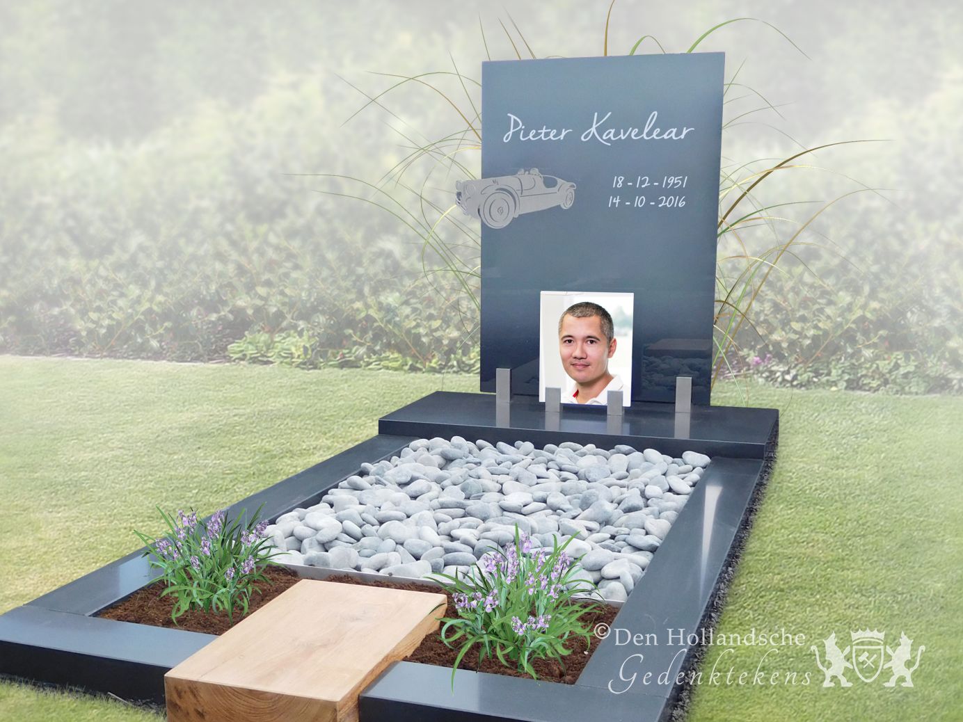 Deze bijzondere eigentijdse grafsteen is gemaakt van natuursteen, hout, glas en rvs. De liggende delen zijn bewust eenvoudig gehouden om zo het staande deel meer nadruk te geven. Hoewel het liggende deel iets eenvoudiger is, is er wel gebruik gemaakt van hoogwaardige materialen en afwerkingen. De omranding van natuursteen heeft een moderne afwerking gekregen met niet al te veel glans, waarbij aan de voorzijde de omranding wordt doorbroken door een plateau van teakhout. Als grafbedekking is er gekozen voor een deel beplanting en een deel eenvoudige stenen. De in het oog springende glasplaat is gemaakt van modern half doorzichtig en antraciet glas. Hierop is de naam met mooie letters aangebracht. Daarnaast is een model van een klassieke auto in rvs op het glas bevestigd. Als extra persoonlijk element is er een tweede glasplaat toegevoegd met daarop een graf foto.