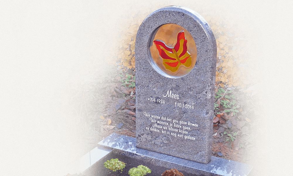 Met de glasfusing techniek brengen we bijzonder fraaie en vaak kleurrijke decoratieve elementen aan op het gedenkteken. Glasfusing is uitstekend toepasbaar op een natuurlijk grafmonument.