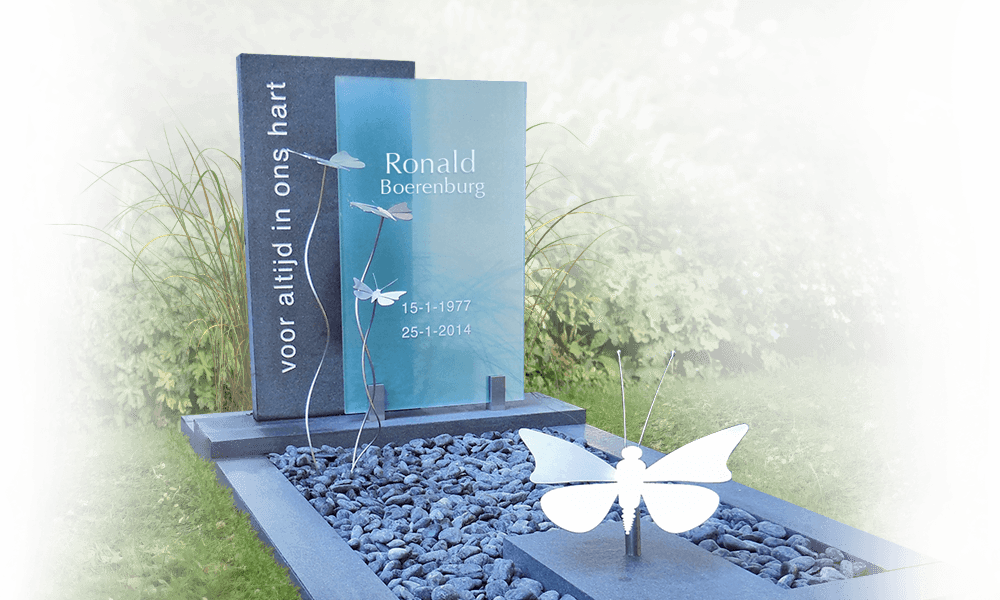 Een grafmonument van glas creëert transparantie en toegankelijkheid. Het is een prachtig en licht materiaal. Door gebruik te maken van verschillende glastechnieken als glasfusing, smelten en emailleren, geven wij het monument een persoonlijke tint.