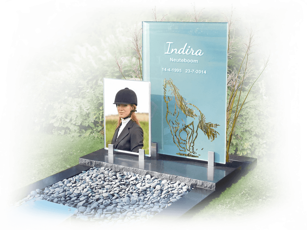 Een foto op de grafsteen kan van klein tot levensgroot op verschillende soorten en vormen glas worden aangebracht.
