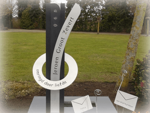 Door creatief te zijn met verschillende materialen en het opschrift harmonieus te plaatsen realiseren we een mooi en uniek gedenkteken.