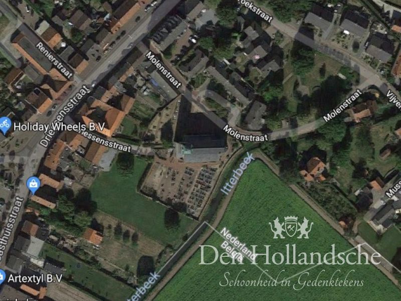Via een mooie oprijlaan, tussen twee woonhuizen vanuit de Driessenstraat, kom je bij de kerk. Naast de kerk en tegen de Itterbeek ligt de begraafplaats.
